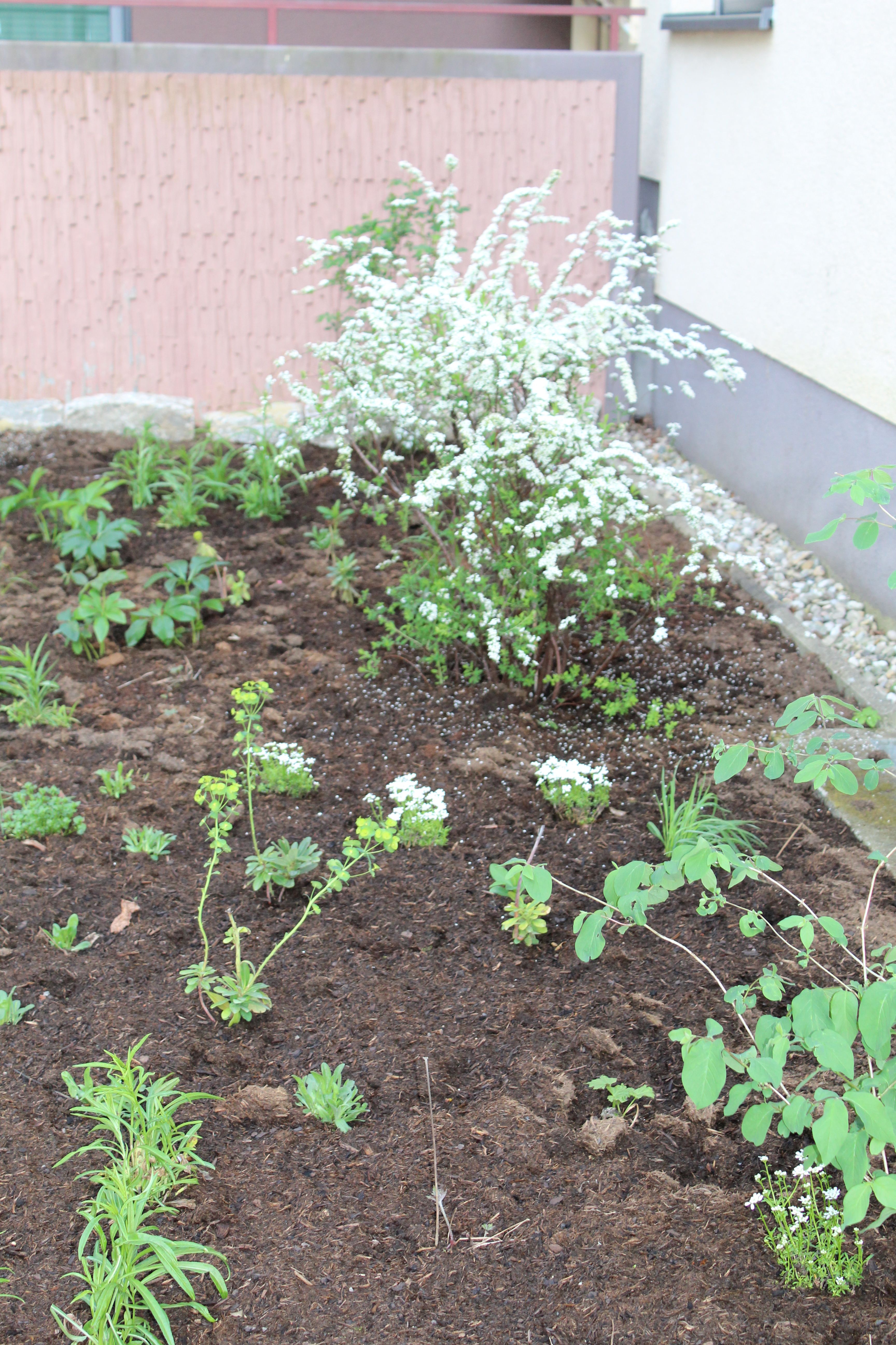Die Brautspiere, blaue Heckenkirsche und Zimtrose, aber auch verschiedene Gräser und Stauden wachsen und gedeihen seit einigen Tagen in dem Beet vor dem Rathaus, das Mitarbeiter des städtischen Bauhofs bepflanzt haben.