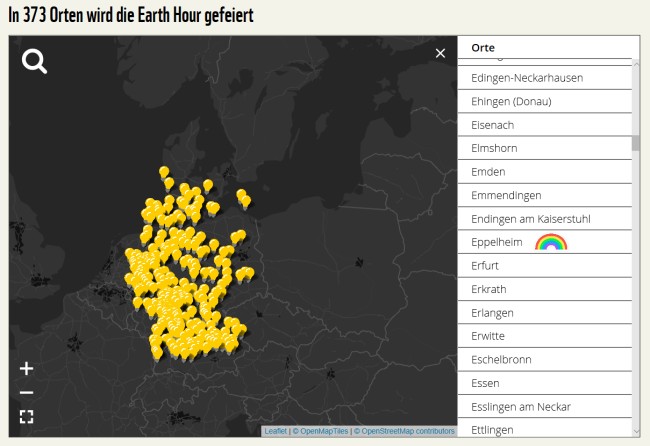 Deutschlandkarte der teilnehmenden Städte an der Earth Hour, mit dabei: Eppelheim